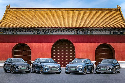 在城市道路上行驶的一排奥迪车拍摄